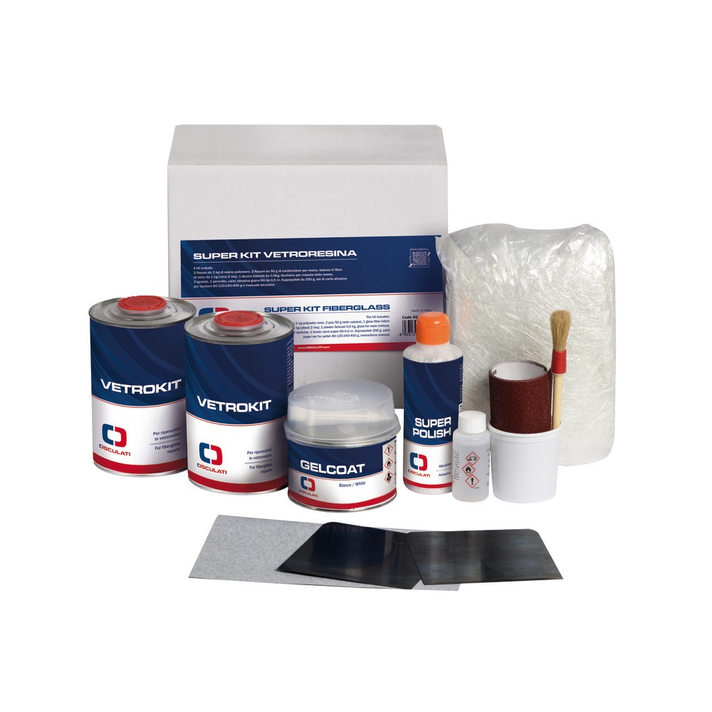 - 2 x 1 kg Flaschen Polyesterharz; - 2 x 50 g Flaschen Harzhärter; - 1 x 1 kg Glasfasertuch (ca. 2 qm); - 1 x 0,5 kg Gelcoat-Spachtel; - 1 x 0,5 kg Harzmischbecher;