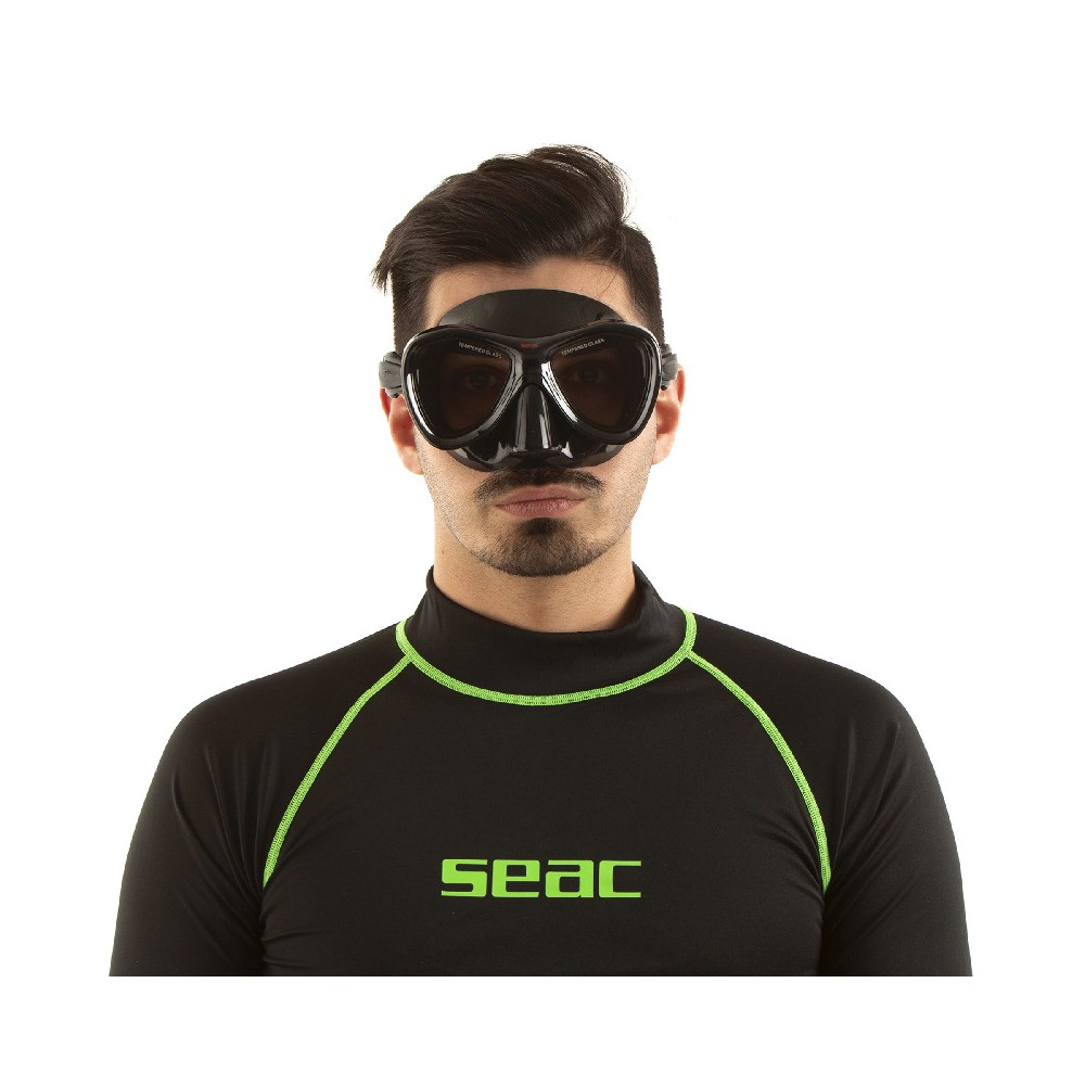 Die Seac Cove wurde für alle entwickelt, die eine vielseitige Maske suchen, die sich perfekt zum Sporttauchen und Speerfischen eignet und nicht auf das entspannende Schnorchelerlebnis verzichten möchte. Die Tauchermaske Seac Cove verfügt über zwei symmetrische Linsen aus gehärtetem Glas und einen weichen, hochwertigen, hypoallergenen schwarzen Silikonkörper mit unterschiedlichen Dicken für eine perfekte Passform. Durch ihr reduziertes Innenvolumen ist die Tauchermaske Seac Cove auch für tiefe Tauchgänge und Freitauchgänge perfekt geeignet. Dank des dicken Silikonbandes im Nacken sitzt sie fest auf dem Gesicht. Sie lässt sich mit einem Doppelknopf-Schnallensystem an den Seiten des Rahmens auf beiden Seiten leicht einstellen. Dank ihres kompakten Designs und der faltbaren Schnallen nimmt sie wenig Platz in Ihrer Tasche ein.