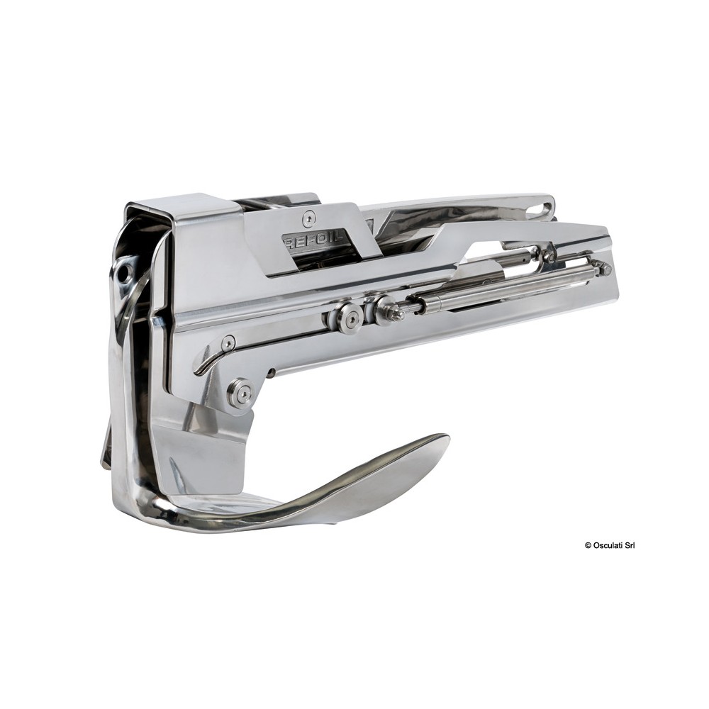 Gleichzeitig ermöglicht eine Kippbewegung das automatische Abwerfen des Ankers, wobei ein sicherer Abstand zum Bug eingehalten wird. Die Nase hat einen Auszugshub von 20 cm, der vor allem für vertikale Bögen geeignet ist. Sein leichtes und sportliches Design passt gut zur Lackierung des Rumpfes und seine Stahlkonstruktion ist für hohe Haltekräfte ausgelegt.
