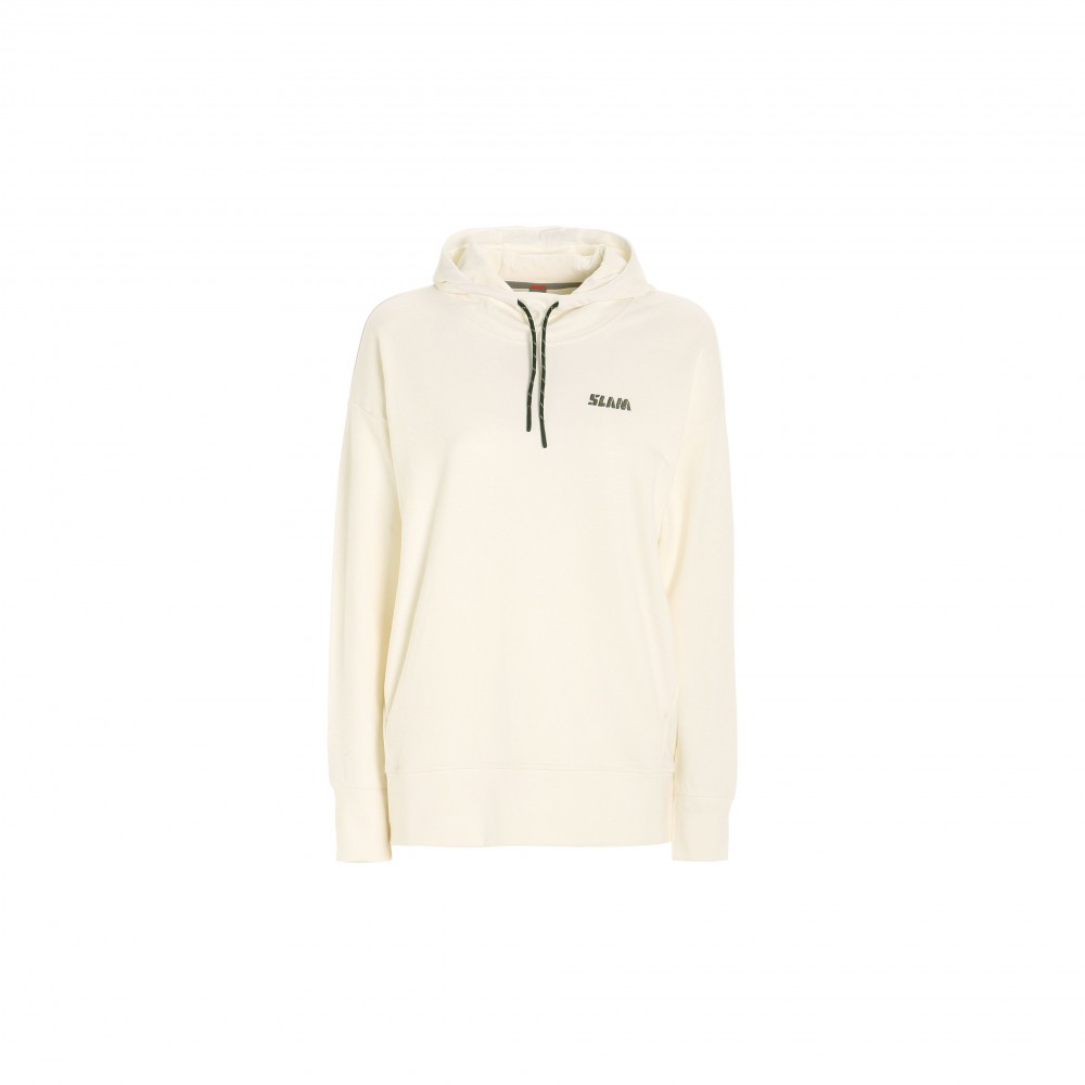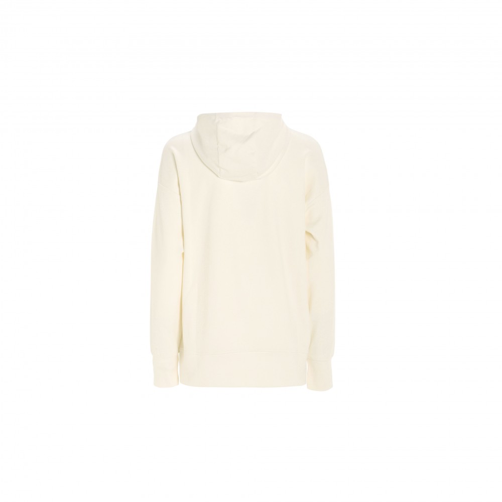 Damen-Sweatshirt aus weichem Interlock aus zertifizierter Bio-Baumwolle (GOTS); Weicher, kohlenstoffgebürsteter Strickstoff, kompakt und formstabil; Große, umhüllende Kapuze mit verstellbarem Kordelzug; Zwei große, versteckte Seitentaschen; Elastischer Rippbund an Saum und Bündchen; Personalisiertes Schweißband im Kragen; Logo auf der Brust; Bequeme Passform