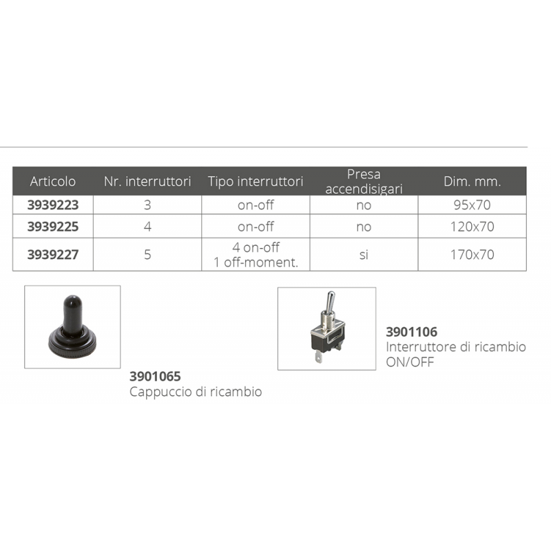 Black aluminum electrical panel with lever switches protected by rubber cap and fuse holder with 5AMP glass fuse (5x20) 3930002/5/10.