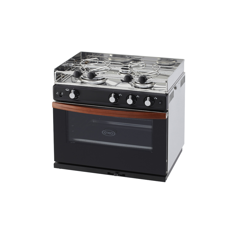 Stainless steel 3-burner stove with tempered glass door, real wood handle, oven (19 L capacity, 1500W capacity) equipped with grill (1350W capacity). Equipped with safety thermocouple, side flame guards, cast-iron burners, anti-roll pan retainer, oven door lock and gimbal support (tilting). Electric ignition. Use with propane/butane gas, connection pressure 30 mbar.