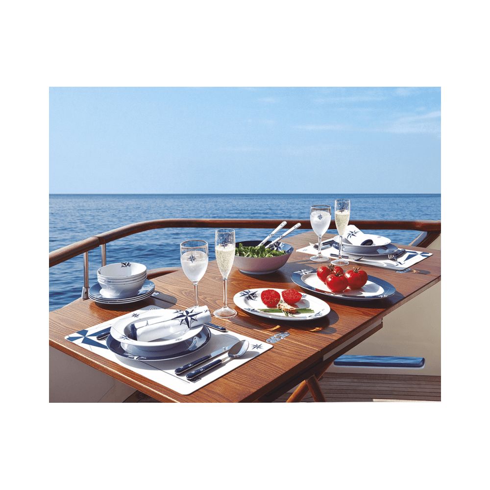 Tableware made of 100% melamine. In shades of navy blue and white. Dishwasher safe. Do not use in oven or microwave. Tableware, cups and glasses have a non-slip ring at the base that prevents them from sliding around on the table. Matching unbreakable glasses made of MSBPA Free. Matching tablecloths, cutlery and other accessories.