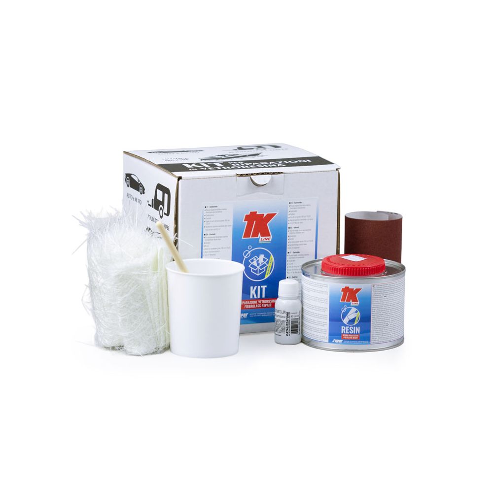 Kit includes: two-component polyester-based resin ml.250, fiberglass fabric, mixing bowl, brush, preparation and finishing sandpaper. For repairing and reinforcing materials as diverse as fiberglass, wood, metal, plastic, marble and concrete.