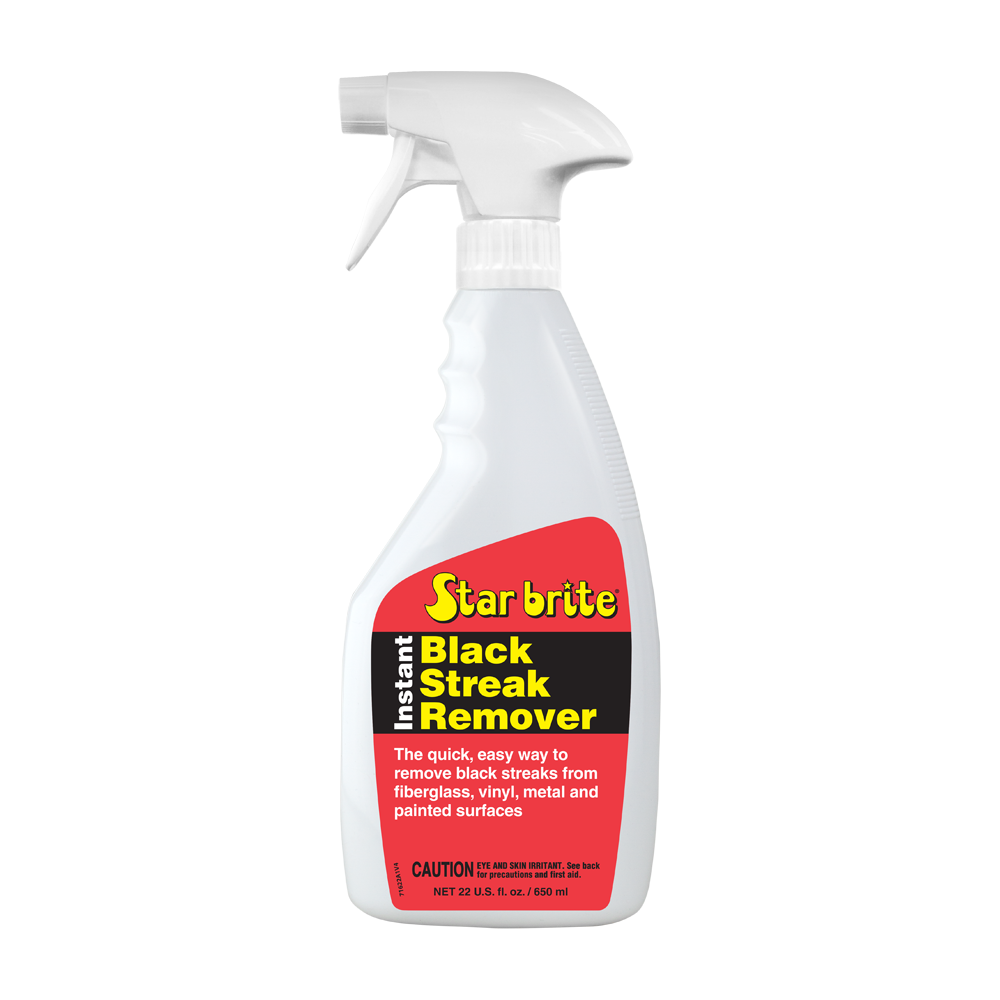 Shake the bottle before use. Spray Star brite Instant Black Streak Remover directly onto the stained area. Leave application for 30 seconds before using a clean cloth, brush or sponge to remove stains. Rinse well with water. Heavily stained surfaces may require a second treatment and light rubbing. Will not remove wax or enamel; safe for fiberglass, vinyl, plastic, stainless, rubber and painted surfaces.