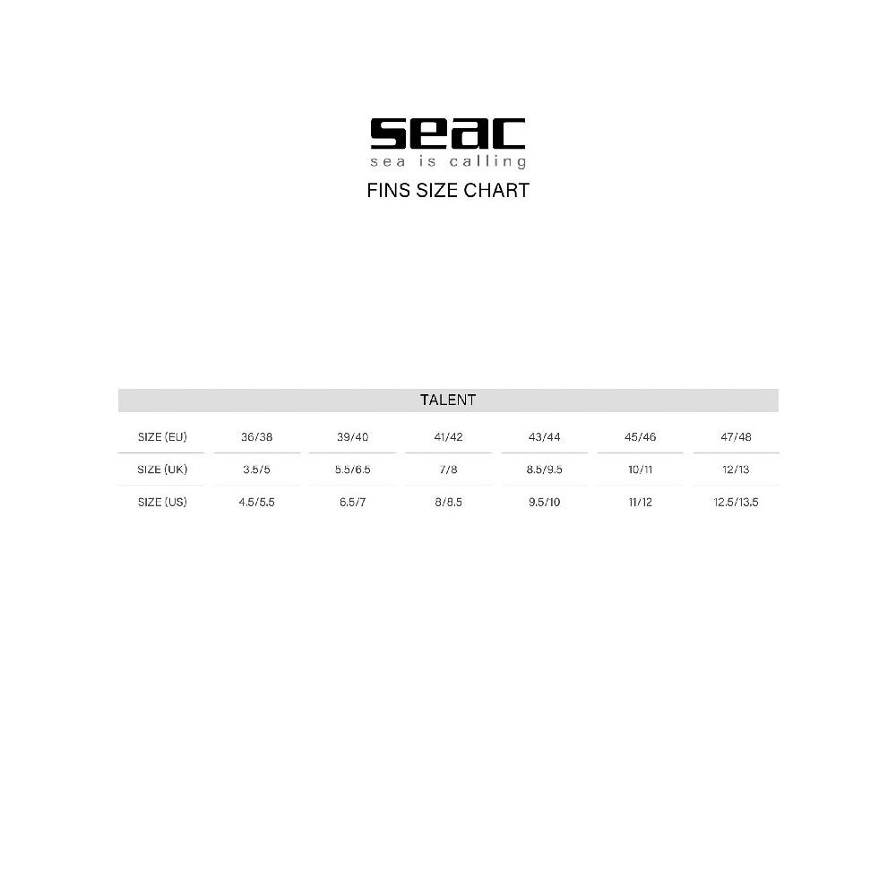 Seac Talent are the special reduced blade fins designed for shallow water freediving and for all divers who dive in waters where the current is stronger. In fact, the blade of Seac Talent fins is 13 cm shorter than the blade of Seac Shout model long fins for spearfishing and freediving. This allows for greater agility during fishing sessions in shallow water, near the shore or rocks. More trained divers also appreciate Seac Talent fins for their buoyancy and responsiveness during current dives. They are available in 6 sizes: 36/38, 39/40, 41/42, 43/44, 45/46, 47/48. The closed bootie of the Seac Talent spearfishing and freediving fins is already designed to be used with 2.5 mm neoprene socks; if you use neoprene socks of this thickness, it is recommended, therefore, that you buy the size of shoe you usually wear every day.