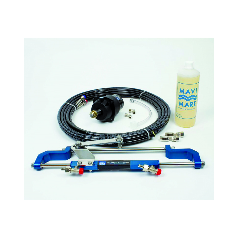 GF90BT kit for motors Yamaha 40/50/60 HPComprises:- Front-mounted GM3-MRA pump, equipped with check and overpressure valve. Possibility of semi-recessed mounting by means of square flange included:- Pistons 7, Volume 14 cm3, max pressure 50 bar- Cylinder MC90B, volume 75 cm3, stroke 100 mm, rod Ø mm. 12- Hydraulic oil 1 lt, 2 hoses R7 1/4 length mt. 5,00, connected on one side only + 2 recoverable fittings to make the desired length.