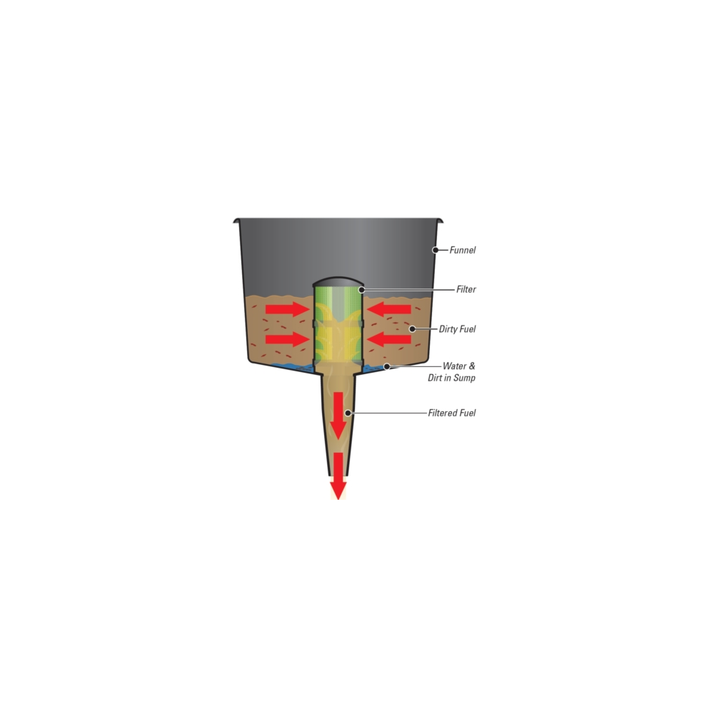 Funnel with integrated filter designed to filter water, dirt and debris from most fuels (including gasoline, diesel, heating oil and kerosene). The model is conductive and can be grounded.