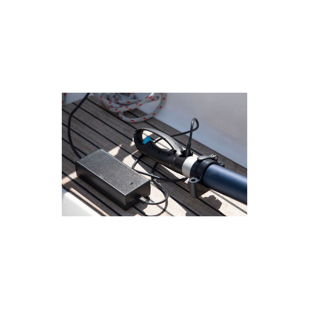 220V battery charger for Temo 450 - compact, efficient, included with the motor. This 220V battery charger is designed specifically for the Temo 450 and is included with purchase. With an output of 116 watts, it allows the battery to be fully recharged in about 3 to 3.5 hours, with an average power consumption of 0.37 kWh, or about 0.8 cents (calculated over 3 1/2 hours of use). Compatible with 220V outlets, it is perfect for charging the Temo 450 from the comfort of home or dockside.