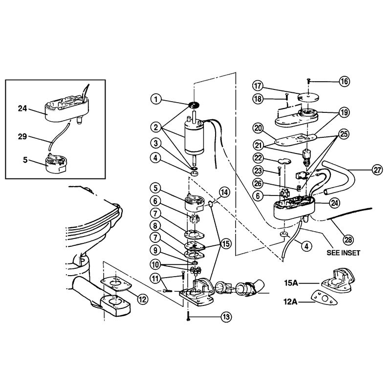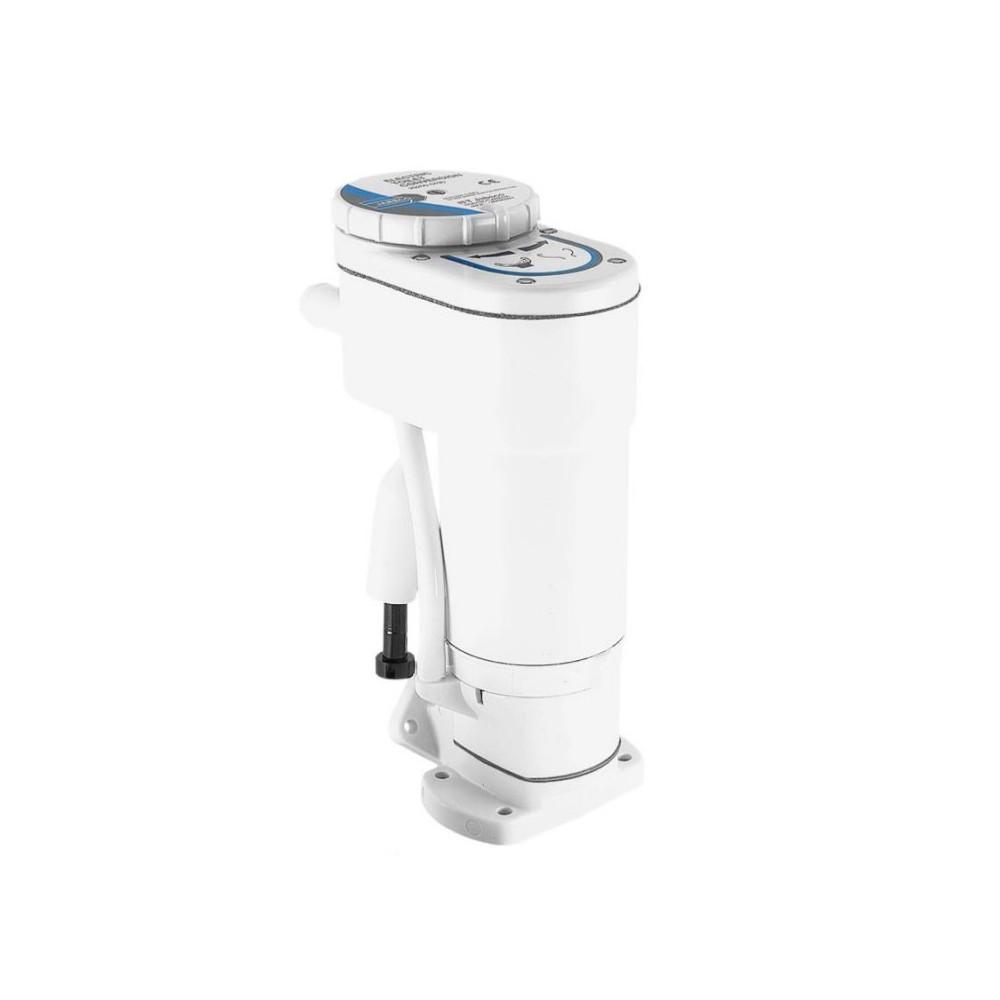 Replaces the hand pump on a Jabsco compact or comfort toilet. Rotary switch operation: flush and flush simultaneously / flush only. Built-in macerator. Connections: Inlet 19mm (3/4"), outlet 38mm (1-1/2"). Current draw 13A, fuse 15A. Dimensions: Height 270mm / Width 87mm / Depth 150mm.