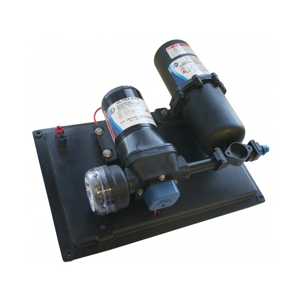 The Jabsco Ultra Max pre-assembled pressure system is a high-performance solution designed to provide reliable water pressure for a variety of applications. Featuring the efficient Par-max 3 pump, filter, and storage tank, this system ensures consistent flow and water pressure. Self-priming up to 3 m. Voltage: 24 V Fuse size: 6 A Maximum flow rate: 13 L/min Cut-in pressure: 0.7 bar Cut-out pressure: 1.4 bar Hose connections: 1/2'' (13 mm) Length: 400 mm Width: 390 mm Height: 140 mm Weight: 3 kg