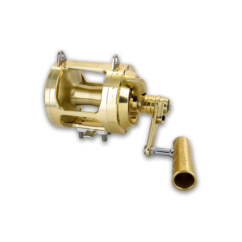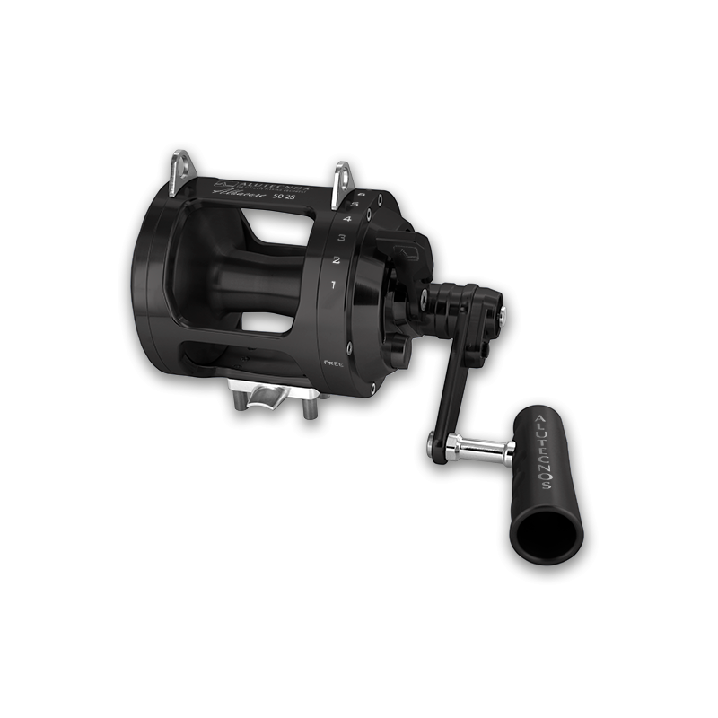Albacore 50 2S, sistema "antiretroceso" infinito, conjunto de caja de cambios de dos botones y brida derecha de una pieza. Equipado con cinco rodamientos de bolas de acero inoxidable protegidos, una rueda libre, engranajes también de acero inoxidable templado y un conjunto de embrague de carbono compuesto de última generación.