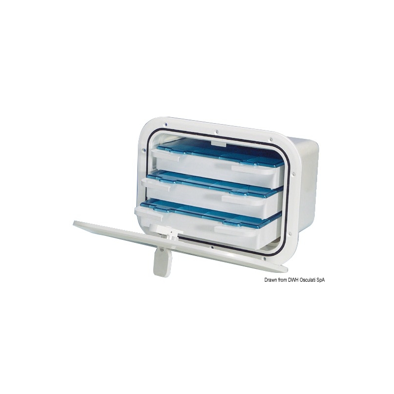 Con junta, equipado con 3 cajones extraíbles con compartimentos internos. Ideal para montar en la pared en embarcaciones de pescadores para guardar accesorios de pesca o como mueble de almacenamiento de herramientas.