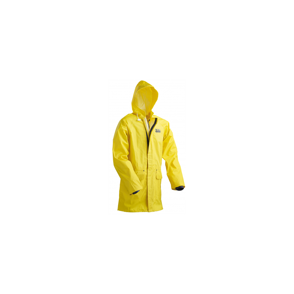 Chubasquero ligero e impermeable de poliéster de color amarillo con revestimiento de PVC y costuras soldadas por alta frecuencia, dispone de capucha con cordón y doble cierre (cremallera y velcro) en la parte delantera, amplios bolsillos con apertura con velcro y puños ajustados con tira elástica.
