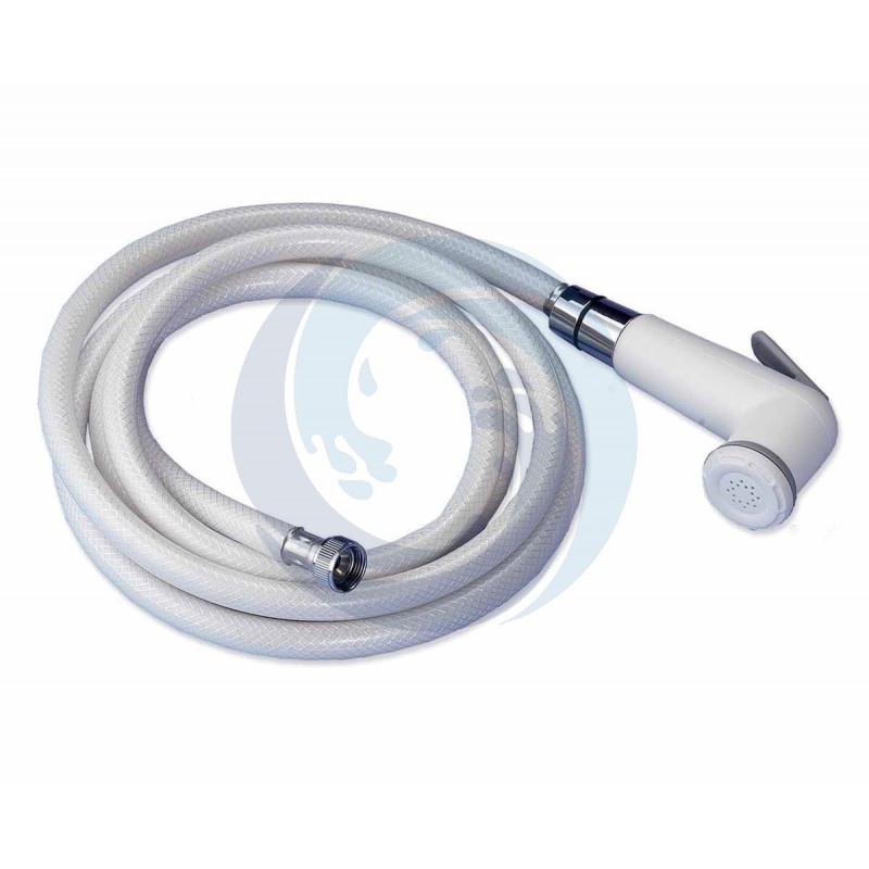 Con una palanca de control con botón pulsador, se puede bloquear para un flujo de agua continuo como un grifo. Incluye manguera blanca.