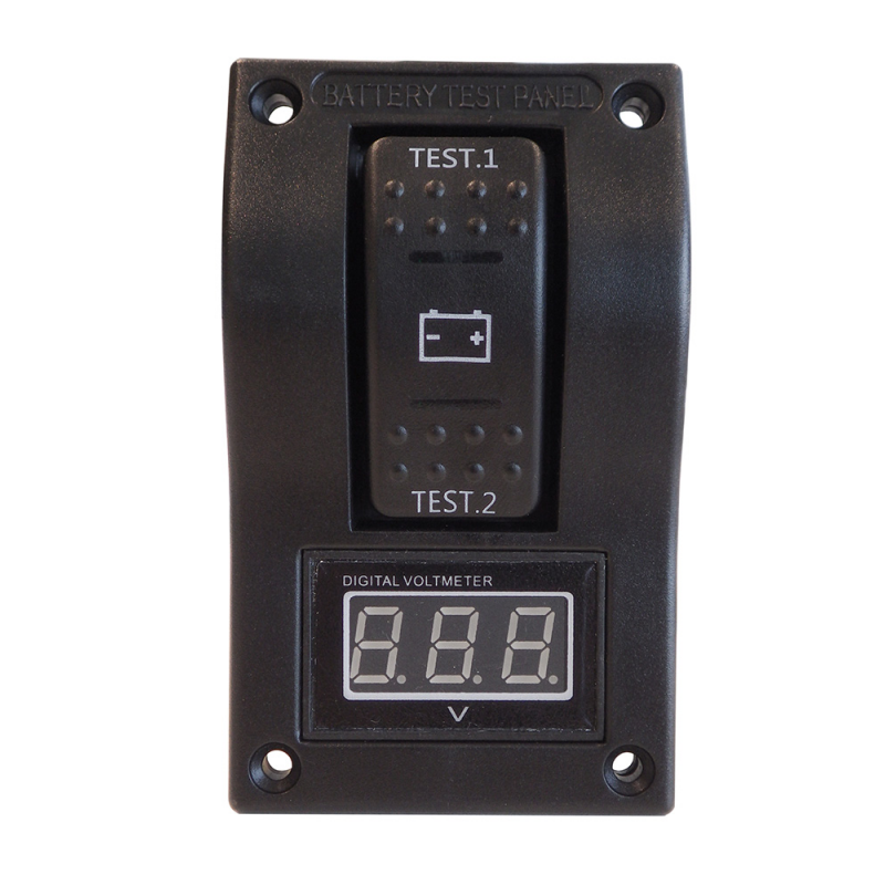 Panneau de test de batterie 12/24 VCC avec voltmètre 3 chiffres facile à lire et sélecteur. Permet de vérifier l'état de deux batteries ou de deux groupes de batteries distincts. Fixation par 4 vis frontales. Dimensions : 60 x 100 mm.