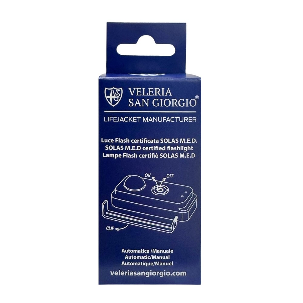 Feu à éclats LED certifié Solas/MED avec clip et ruban pour une fixation facile aux ceintures ou gilets de sauvetage. S'active automatiquement au contact de l'eau, offrant jusqu'à 8 heures d'autonomie. Piles alcalines incluses.