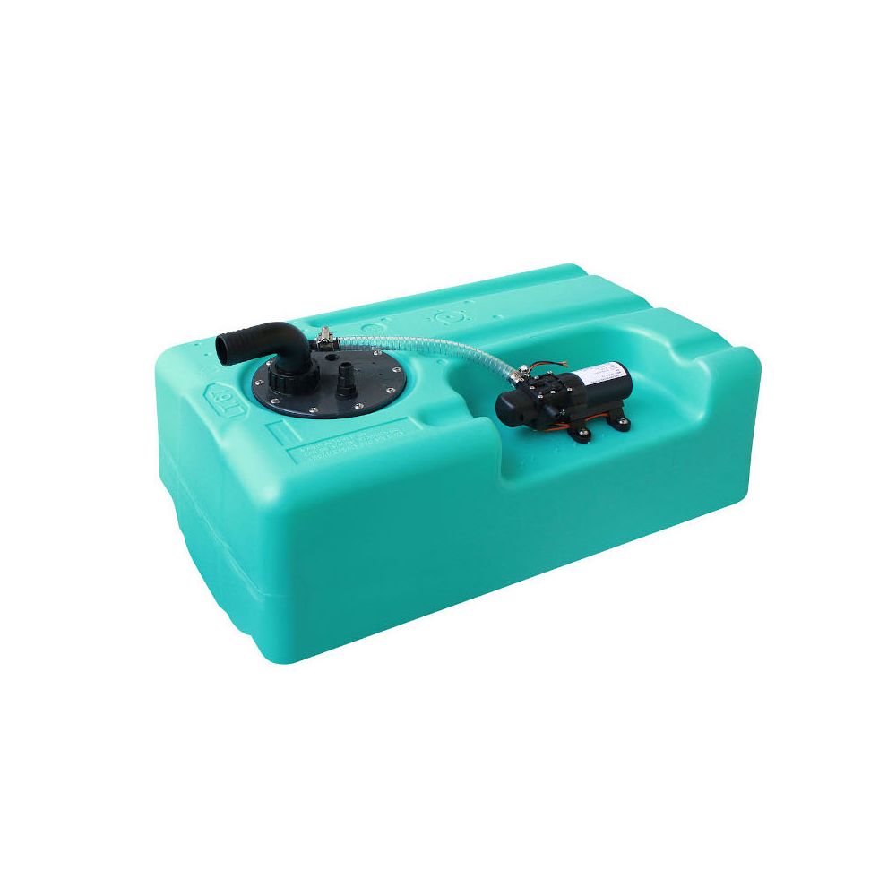 Kit réservoir de 39 litres avec autoclave Jet 4.3 fourthree 12 V 3,5 A, débit 4,3 l/min, équipé d'une buse Ø 38 et d'un évent, recommandé pour les petites embarcations monoplaces. Dimensions : 550 mm x 390 mm x 200 mm (hauteur).