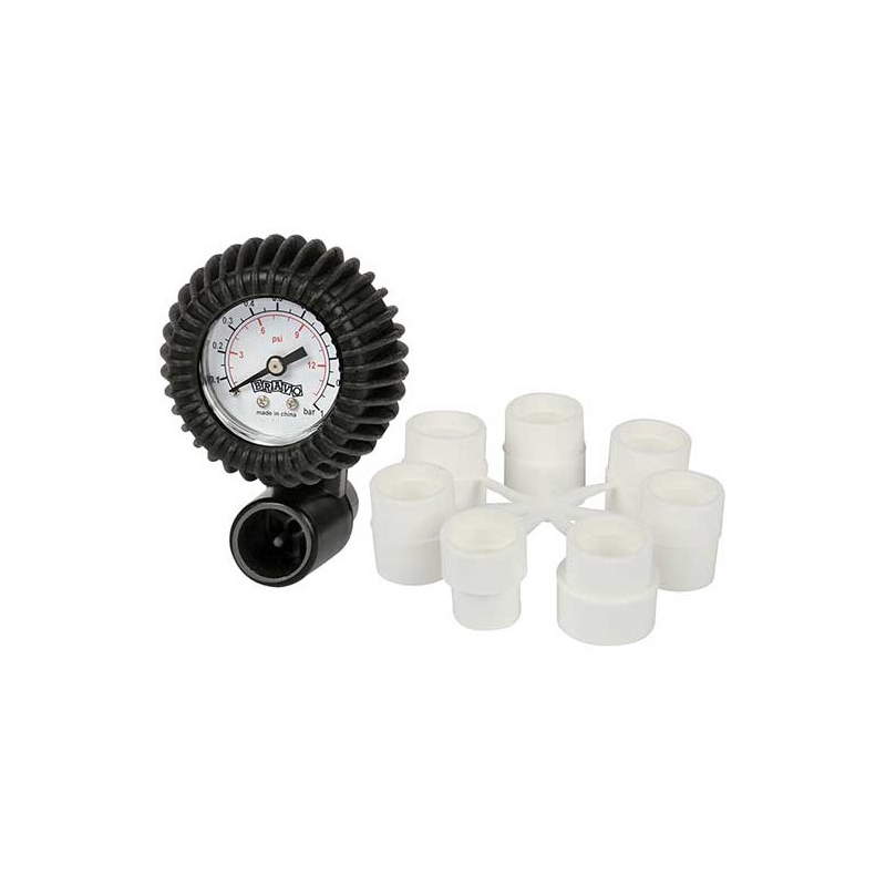Manomètre pour le contrôle de la pression jusqu'à mbar 1000. Inséré entre le gonfleur et la valve, il permet une lecture progressive pendant le gonflage, ou inséré directement dans la valve, une lecture immédiate.