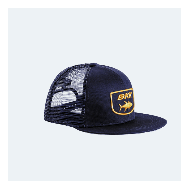 Il BKK Tuna Snapback Hat è un cappello con visiera piatta caratterizzato da una forma a cappello snapback e un design moderno nella parte anteriore ispirato e dedicato ai pescatori di tonno. Il tessuto a rete garantisce la ventilazione necessaria per essere indossato per l'intera giornata in mare.