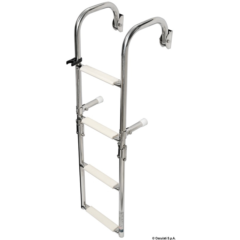 In acciaio inox lucidato a specchio con attacchi arcuati sopra coperta, per una più comoda risalita. Modello con gradini con superficie ovalizzata. Il gradino ovale, rispetto ai tradizionali tondi, é molto più agevole e comodo nell’uso. I gradini nella parte superiore sono ricoperti di pedana in plastica antiscivolo.